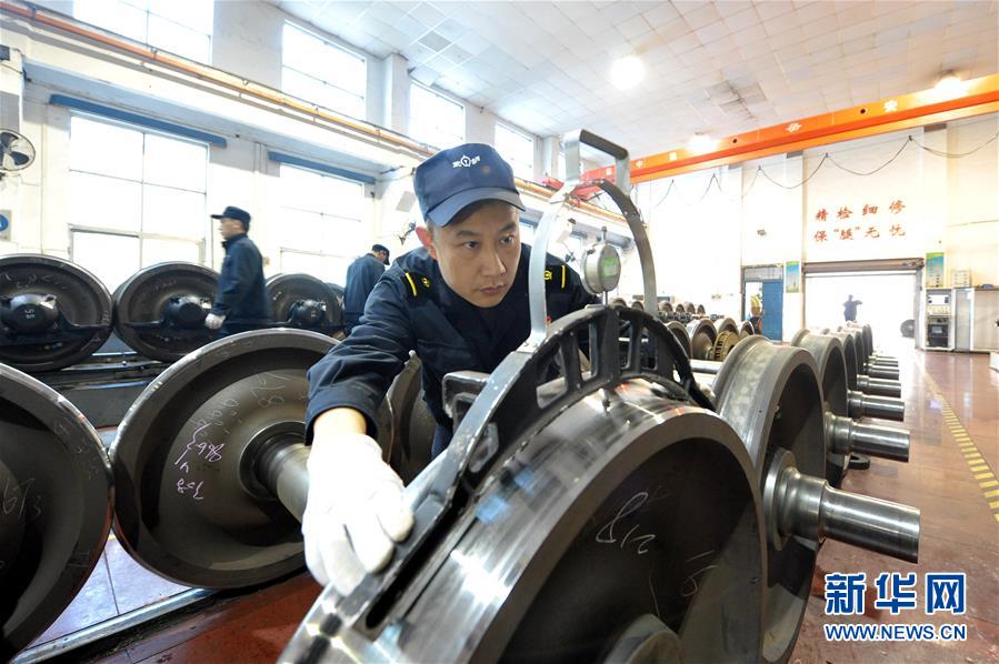 1月22日,质检员汪召坤对火车车轮进行检修。 新华社发(彭琦 摄)