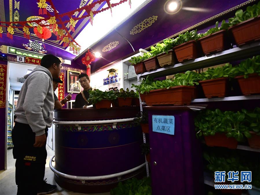 1月21日,旅客在“唐竺古道号”列车的有机蔬菜点菜区点单。新华社发(张龙 摄)