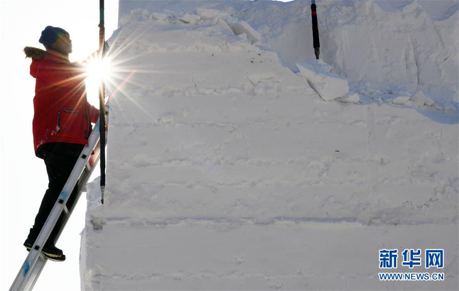 1月22日,参赛队员进行雪雕创作。新华社记者王建威摄