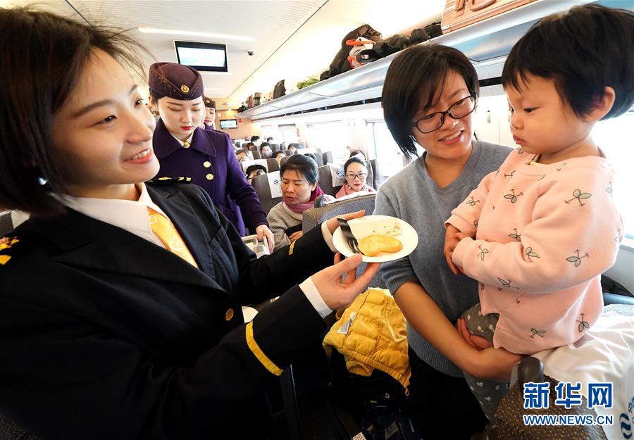 1月22日,由上海虹桥开往北京南的G10次列车乘务员房曼秋(左一)为小朋友送上点心。新华社记者陈飞摄