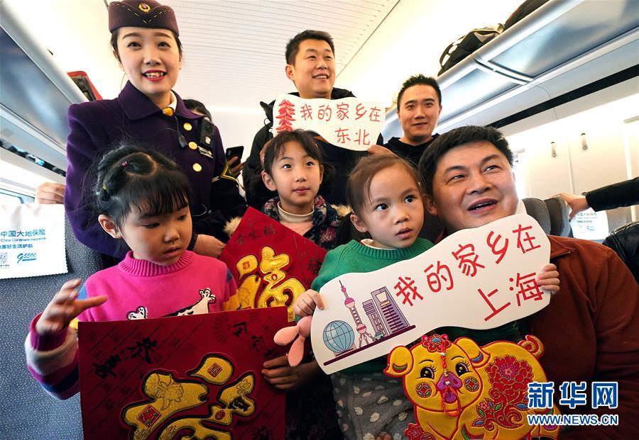 1月22日,旅客在上海虹桥开往北京南的G10次列车上相互拜年送祝福。新华社记者陈飞摄
