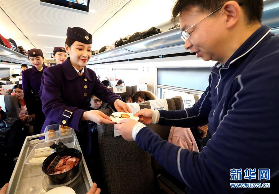 1月22日,由上海虹桥开往北京南的G10次列车乘务员请旅客品尝各地土特产。新华社记者陈飞摄