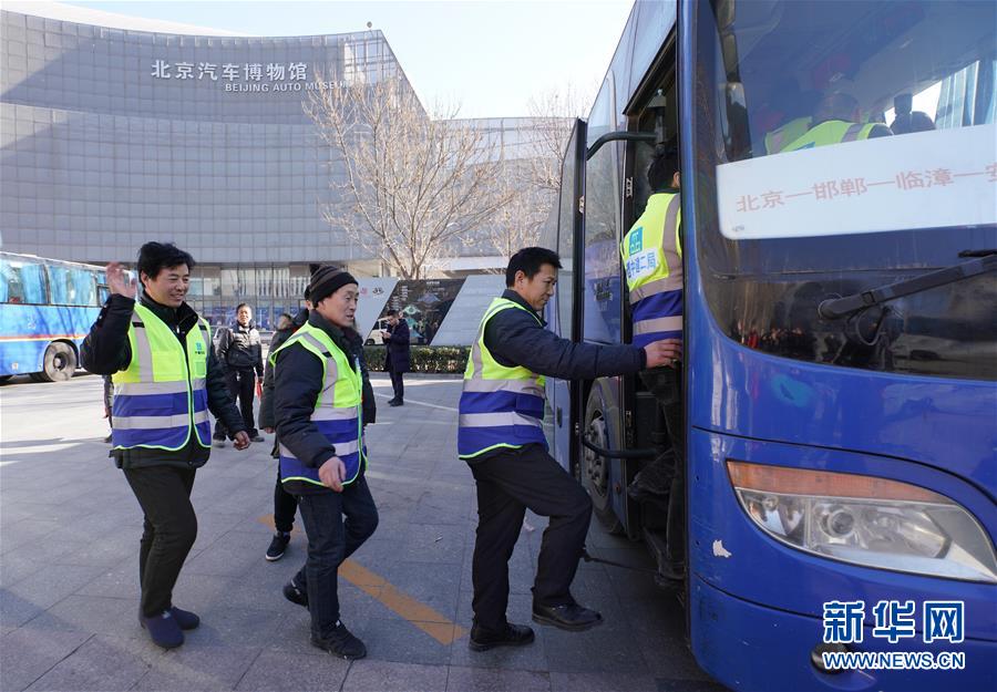1月22日,中建二局的建筑工人登上大巴车准备返乡。 新华社记者 任鹏飞摄