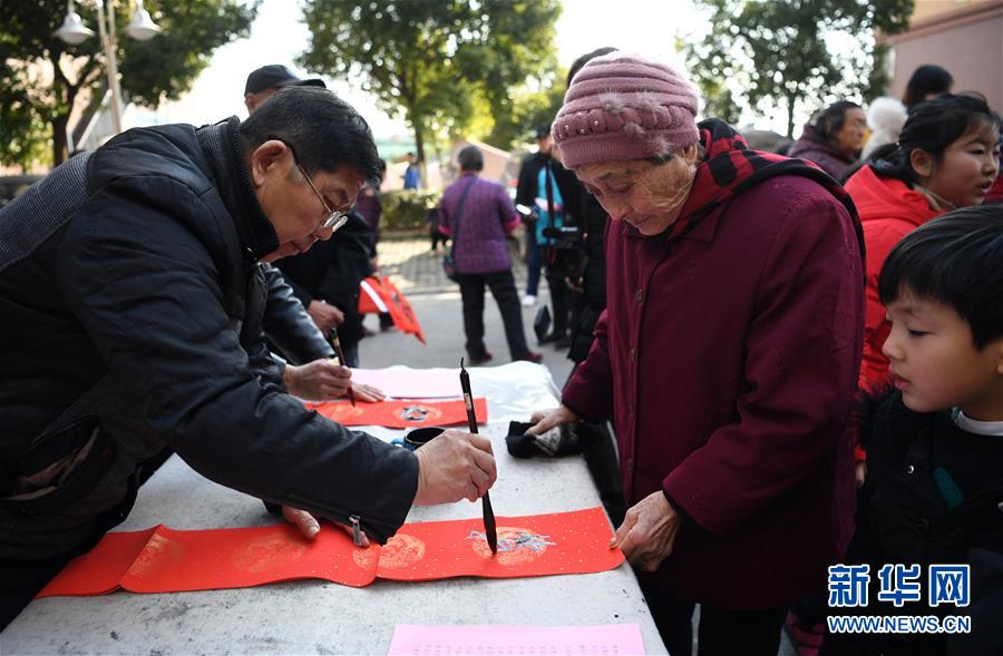 1月22日,书法爱好者在为竹西社区居民写春联。 当日,安徽省合肥市常青街道竹西社区开展“新春送祝福”活动,通过猜灯谜、送春联、趣味游戏等形式,营造浓浓的“年味儿”。 新华社记者刘军喜摄