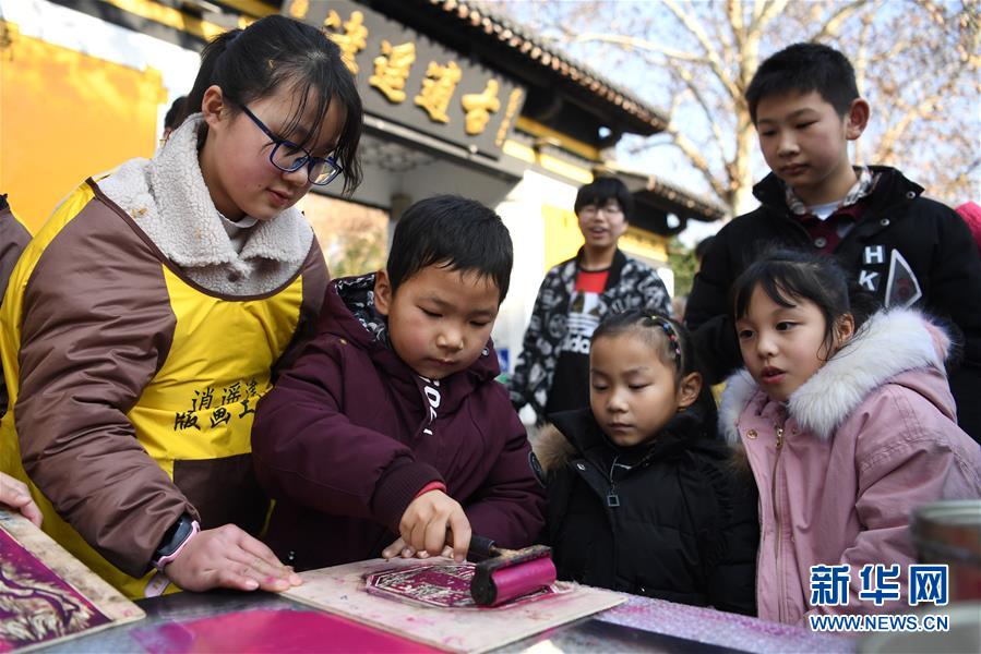 1月22日,小朋友在版画社团成员的指导下体验版画制作。新华社记者刘军喜摄