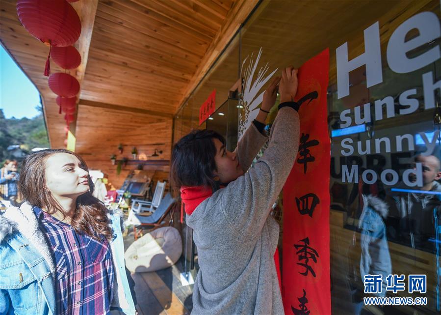 1月22日,来自玻利维亚的留学生丽萨(右)正在民宿的门上贴春联,感受传统中国年的喜庆气氛。新华社记者 徐昱 摄