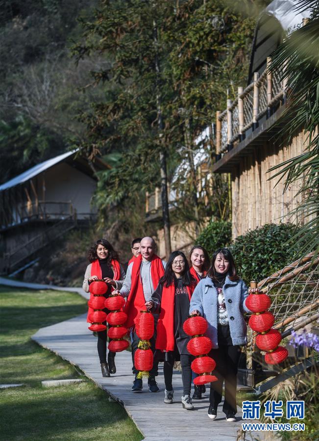1月22日,留学生和临安当地百姓、民宿工作人员一起准备挂灯笼。新华社记者 徐昱 摄