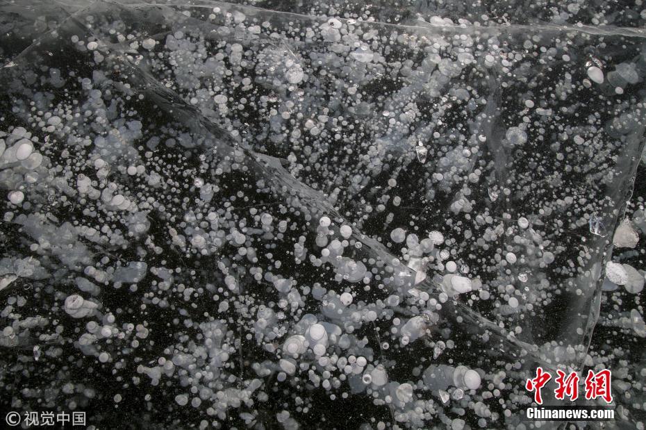 1月22日,吉林省吉林市彩虹桥附近,松花江冰层里出现着白色的气泡景观,吸引着游人观看拍摄。松花江水经过丰满大坝的涡轮机后温度在零上,所以流经吉林市时一年四季不结冰,但是江边水湾出仍然会结冰的,冰层里还会有许许多多成片的气泡,有的像白蘑菇,有的像宝塔,少的几层,多的四五层,有拳头大的,也有豆包大的,还有更小的像黄豆粒大小的,有一串串的,也有单独的。有人说这是由于水底产生的沼气形成的气泡,在上升时来不及“跑”掉而被冻在冰层里了,所以形成了美丽奇特的自然景观。不过今年冬天吉林市的天气并不太冷,冰层也不算太厚,还有许多裂纹,并不时地发出炸裂的声响。朱万昌 摄 图片来源:视觉中国