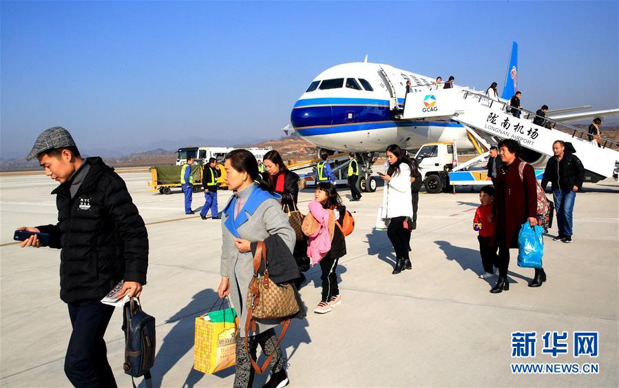 1月22日,乘坐深圳至陇南首航航班的旅客走下飞机。 当日,随着南航CZ8433次航班抵达甘肃陇南机场,深圳直飞陇南的航线正式开通。 新华社发(吴庭栋 摄)