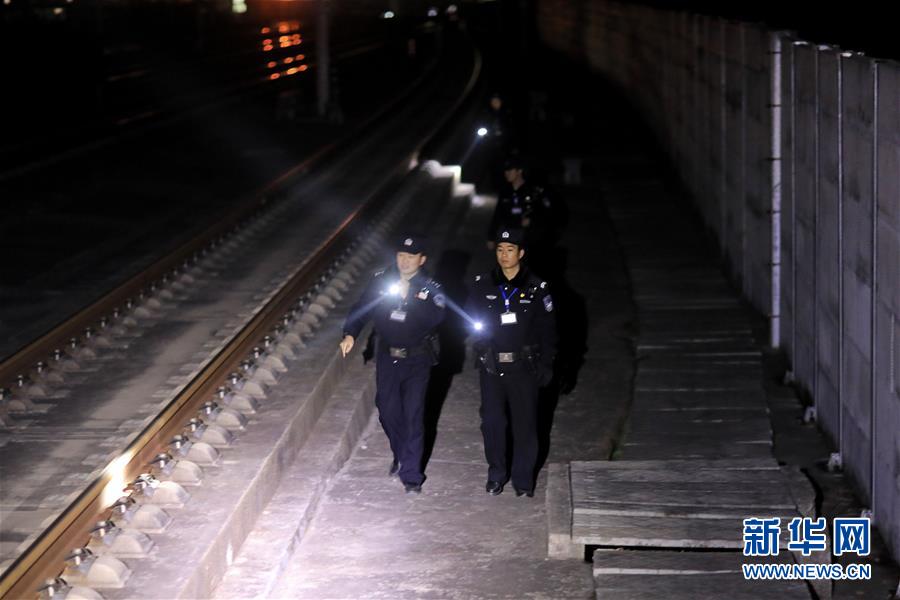 1月22日深夜,民警在贵广高铁线路上沿线巡查。 新华社记者欧东衢摄