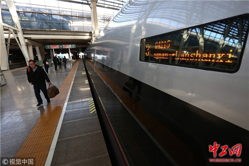 2019年1月21日13点15分,北京地区春运首趟复兴号增开旅客列车G4251次从北京南站驶出,这是铁路部门首次使用复兴号作为增开列车。停靠在北京南站的G4251次列车。