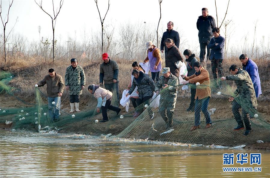 1月23日,在安徽省肥东县古城镇友谊村,合作社员工与农户一起在养殖基地里捕鱼。新华社发(许庆勇 摄)