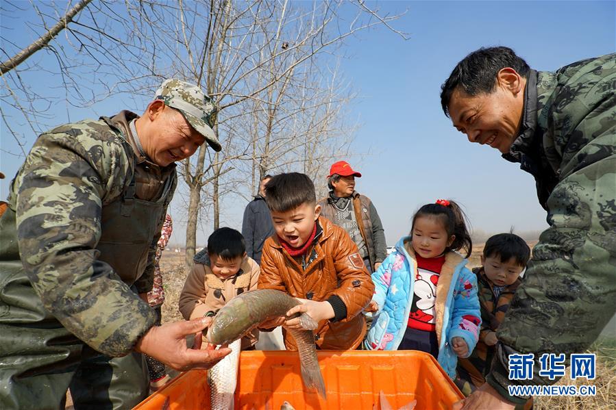 1月23日,在安徽省肥东县古城镇友谊村,小朋友被刚捕捞上来的鲜鱼吸引。新华社发(许庆勇 摄)