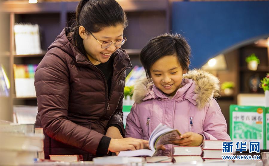 1月23日,在武邑县新华书店内,学生在家长陪伴下选购图书。新华社记者 李晓果摄