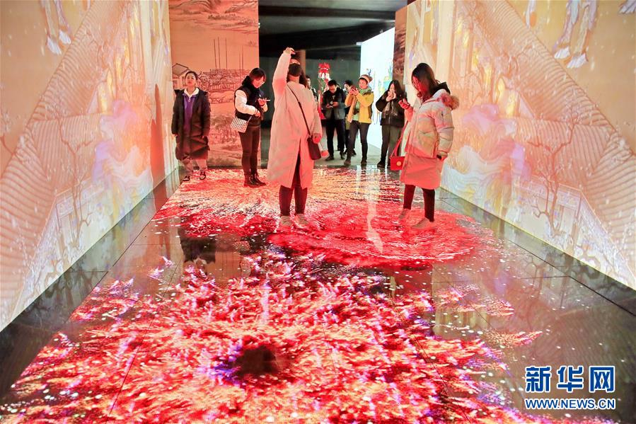 1月23日,观众在“宫里过大年”数字沉浸体验展“赏灯观焰”部分参观体验。新华社发(刘宪国 摄)