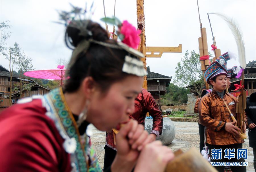 在广西融水苗族自治县双龙沟景区梦呜苗寨,潘杰辉和潘英华为游客表演传统苗族民俗(1月15日摄)。新华社记者陈君清摄