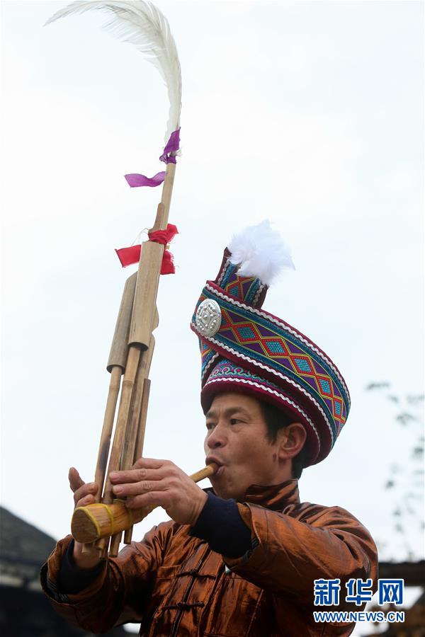 在广西融水苗族自治县双龙沟景区梦呜苗寨,潘杰辉为游客表演吹芦笙(1月15日摄)。新华社记者陈君清摄