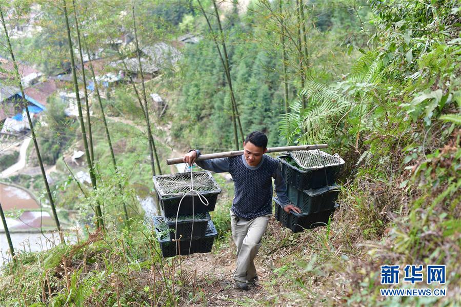 在位于黔桂交界的乌英苗寨,梁秀前挑着百香果树苗上山种植(2018年3月29日摄)。新华社记者黄孝邦摄