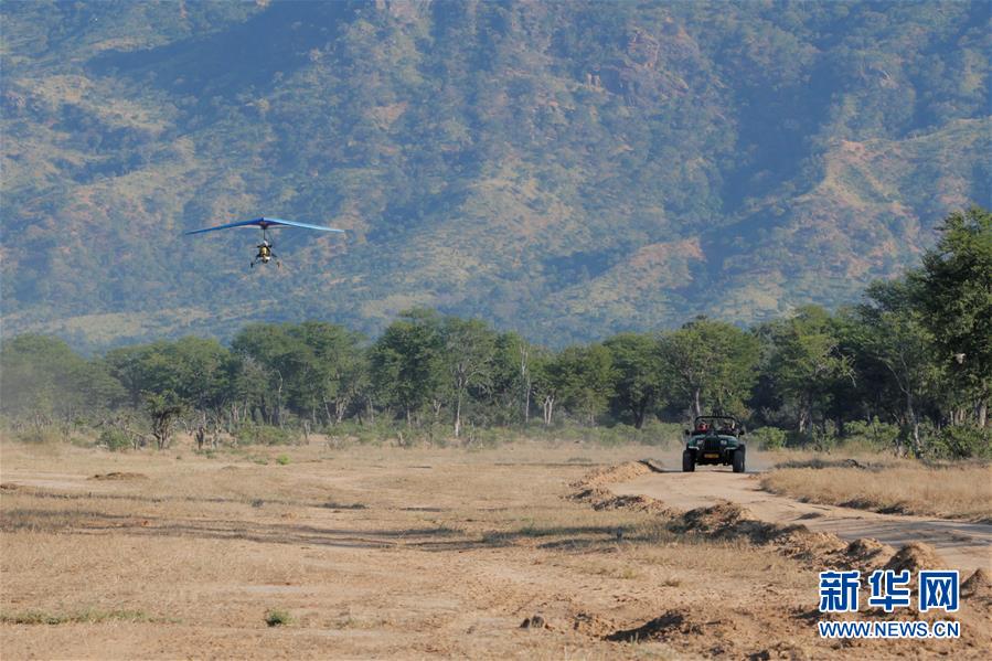 在津巴布韦马纳普斯保护区,中国野保志愿者驾驶车辆跟随准备降落的三角翼飞行器(2017年6月15日摄)。新华社发(陈雅琴摄)