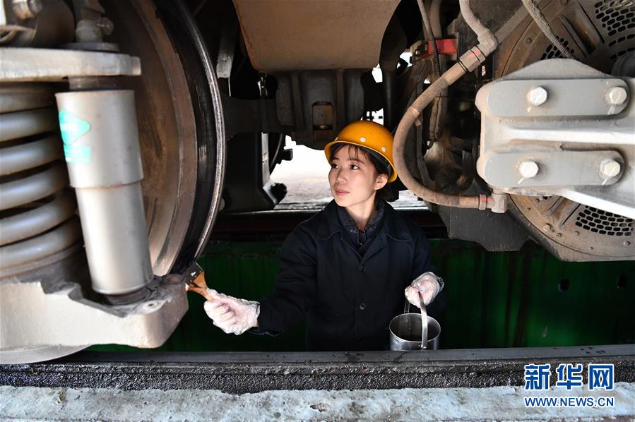 1月23日,探伤组女工于晓萌在往机车车轮上涂刷耦合剂。 在中国铁路北京局集团公司天津机务段,有一支全部由女子组成的探伤班组。姑娘们使用多种探伤方法对机车零部件进行全面“体检”,确保铁路运输安全。 新华社记者 李然摄