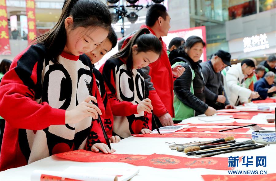 1月23日,小朋友在现场写春联。新华社记者 方喆 摄
