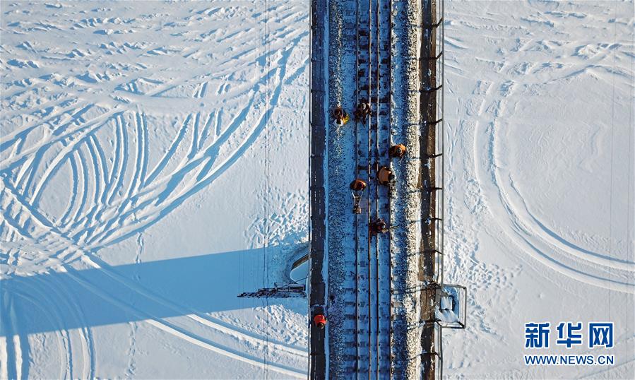 1月23日,在黑龙江省漠河市嫩林线659公里处,加格达奇工务段线路工在进行铁路冻害整修作业(无人机拍摄)。 每年冬季,黑龙江省加格达奇工务段的铁路工人都要冒着零下30多度的严寒进行野外作业,桥隧工要对桥梁、隧道、涵洞进行除冰工作,线路工要对铁路冻害进行整修工作,这些平凡的铁路工人不分昼夜,坚守在铁路线上,用辛勤的工作和不畏严寒的勇气默默守护旅客回家的路。 新华社记者 才扬 摄