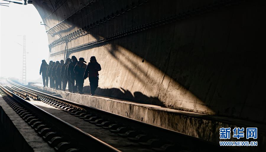 1月23日,桥隧工走进集宁隧道。 春运期间的唐呼线格外繁忙,为保证列车运行安全,中国铁路呼和浩特局集团有限公司集宁工务段卓资山路桥车间的桥隧工每天都要在管辖的隧道内检查、除冰、清淤。其中,集宁隧道是结冰最严重的隧道之一,也是桥隧工进出最频繁的地方。他们在刺骨的寒风中,在昏暗的光线下,为通过的列车排除隐患。 新华社记者 虞东升 摄