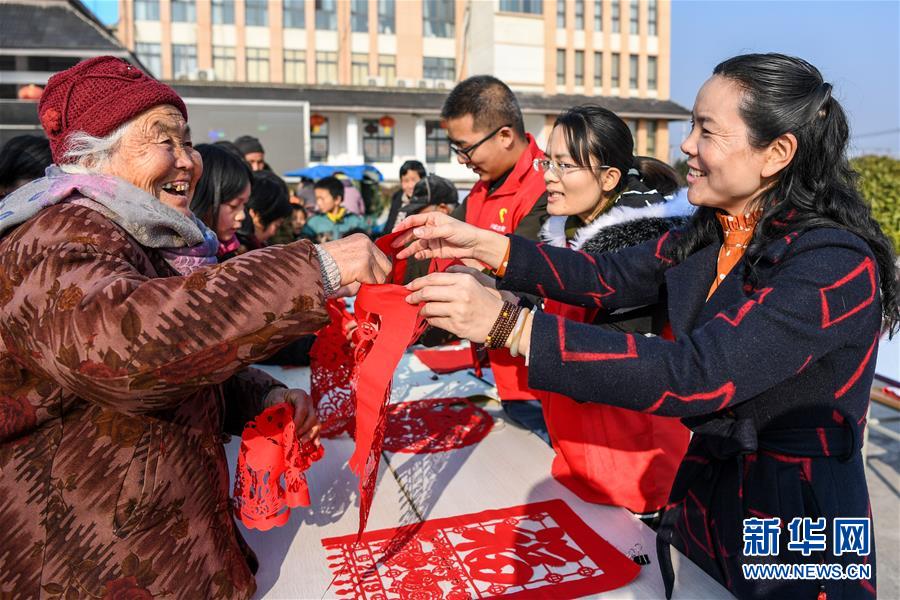 1月23日,泗洪县纪委监委的工作人员为当地村民送上“廉洁”主题的剪纸。 当日,江苏省宿迁市泗洪县纪委监委在泗洪县半城镇文广中心广场举行廉政文化进乡村活动,为当地群众送去新春祝福。 新华社记者 李博 摄
