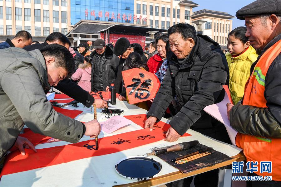 1月23日,在泗洪县半城镇文广中心广场,当地村民排队领取“廉洁”主题春联。 当日,江苏省宿迁市泗洪县纪委监委在泗洪县半城镇文广中心广场举行廉政文化进乡村活动,为当地群众送去新春祝福。 新华社记者 李博 摄