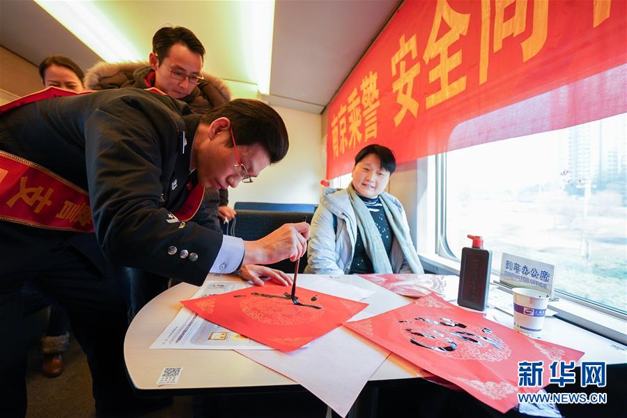 1月23日,在G7109次列车上,南京铁路公安处乘警支队的民警为旅客书写“福”字。新华社记者 季春鹏 摄