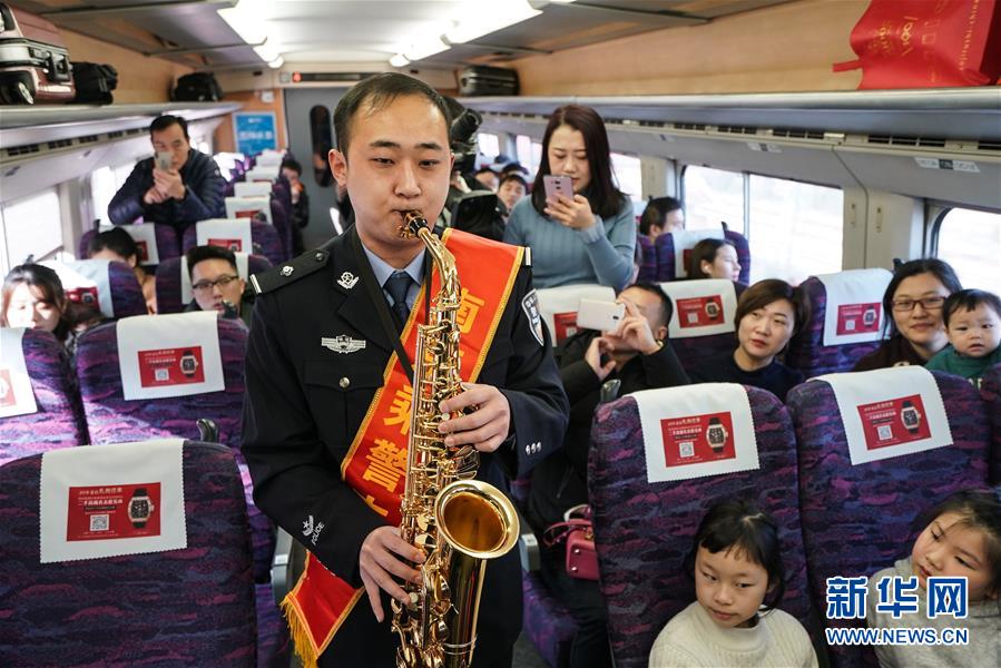 1月23日,在G7109次列车上,南京铁路公安处乘警支队的民警为旅客演奏歌曲。新华社记者 季春鹏 摄
