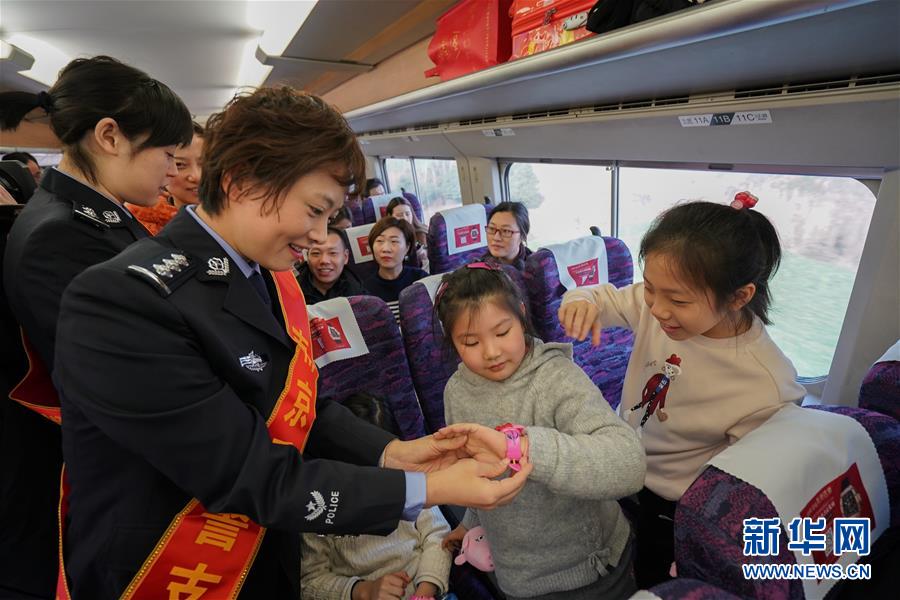 1月23日,在G7109次列车上,南京铁路公安处乘警支队的民警向小朋友赠送礼物。新华社记者 季春鹏 摄