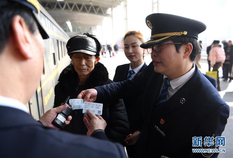 1月23日,刘凤敏(右一)带着徒弟协助重点旅客进站乘车。 今年春运,对中国铁路上海局集团有限公司蚌埠站39号客运值班员刘凤敏来说有点不寻常,除了像往年一样全心投入春运服务工作之外,刘凤敏还正式当起了“师傅”,带起新人,为“洪祥工作室”物色、锻炼新一代传承人。 “洪祥工作室”是蚌埠站的特色服务品牌,由全国劳动模范、蚌埠站原39号客运值班员路洪祥创办。2004年刘凤敏接替退休的路洪祥成为“洪祥工作室”的传承人,为老、幼、病、残、孕等重点旅客提供便利服务。2020年,刘凤敏将要退休,借助春运这个“练兵”平台,刘凤敏开始带徒弟,希望从中挑选出“洪祥工作室”下一代的传承人,将39号客运值班员的服务精神继续传递下去。 新华社记者刘军喜摄