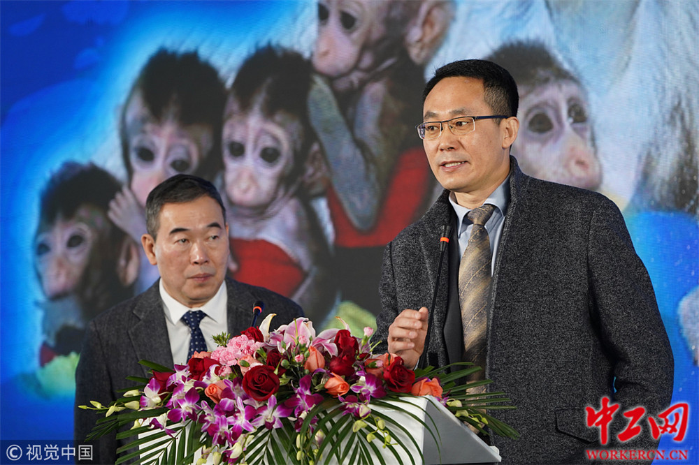 2019年1月23日,中科院在上海举行“生物节律紊乱体细胞克隆猴模型”新闻发布会,中国科学家首次利用基因编辑方法,并通过体细胞克隆技术,获得5只生物节律核心基因BMAL1敲除的克隆猴,在国际上首次成功构建一批遗传背景一致的生物节律紊乱猕猴模型。图为研究团队主要成员。