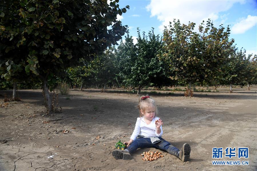 美国95%以上的榛子产于俄勒冈州,尤其是有着110多年商业种植历史的威拉米特河谷地区,当地800多个家庭农场以此为生。科尔曼家族在这里种植榛子已有六代人。 中国是当地榛子的最大市场,每年60%以上的当地榛子都带壳销往中国。因为看好中国市场的发展前景,当地果农近年来不断扩大种植面积。 但果农们没想到,新树种虽能抗病虫,却无力抵挡美国发起对华经贸摩擦带来的危害。科尔曼家族呼吁,不应让中美间暂时的摩擦把凝结着传统、未来和希望的榛子树连根拔起。 这是2018年9月10日,在美国俄勒冈州波特兰市南部威拉米特河谷,科尔曼家族果农埃米的女儿普雷斯莉在自家榛子树果园里玩耍。 新华社记者 吴晓凌 摄