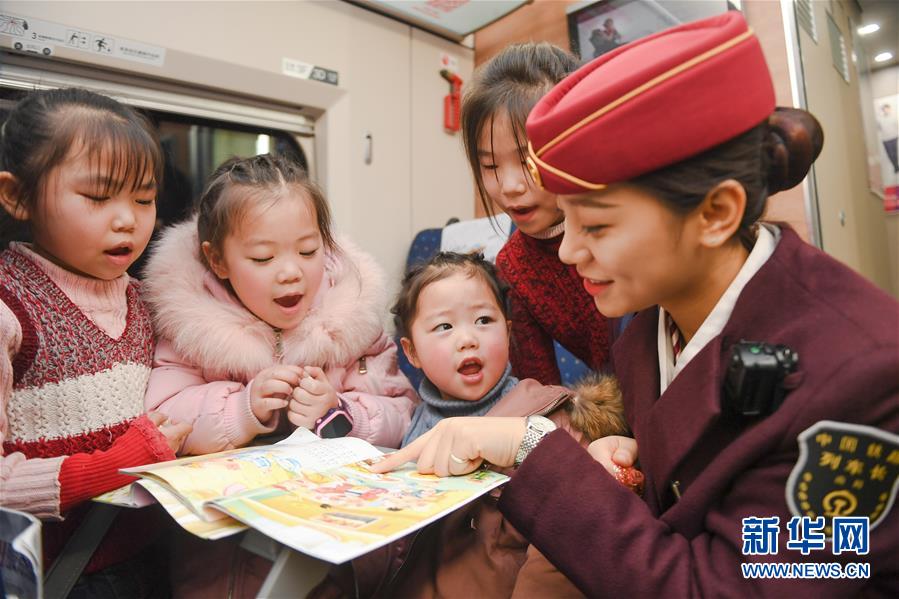 1月24日,在重庆开往福州的G1755次列车上,乘务员为几名来自四川的“小候鸟”讲绘本故事。 新华社记者 宋为伟 摄