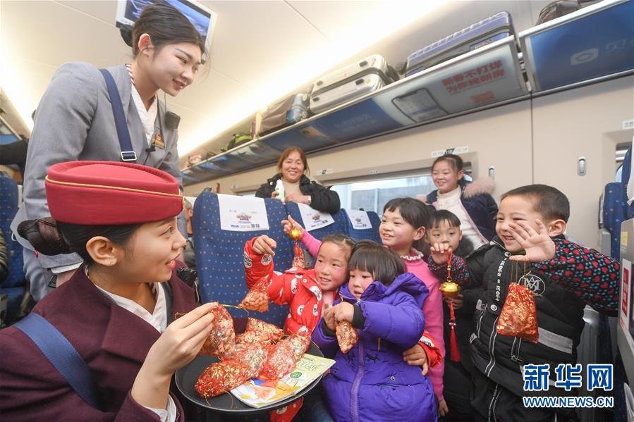 1月24日,在重庆开往福州的G1755次列车上,乘务员和“小候鸟”做游戏。新华社记者 宋为伟 摄