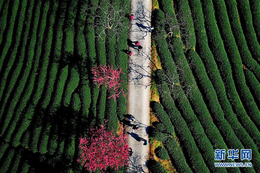 1月24日,游客在台品樱花茶园里游玩(无人机拍摄)。 新华社记者 魏培全 摄
