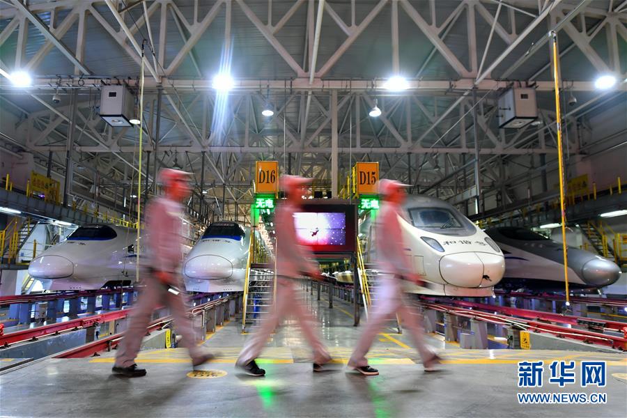 1月24日,检修工作人员走在太原车辆段动车所内。