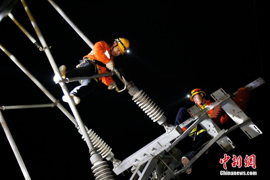 接触网工在支架上进行腕臂检修。文/张富淼 图/丁波