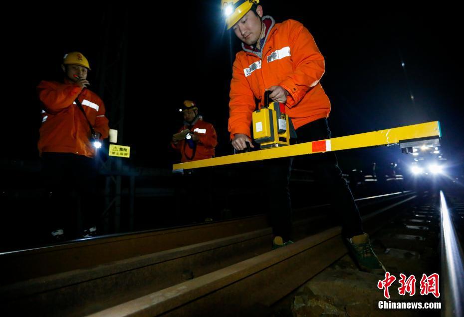 作业者正用激光测量仪测量接触线的导高拉出值,保证数据在标准值内。文/张富淼 图/丁波