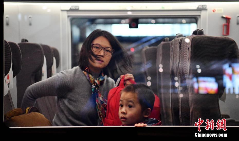 一位母亲带着孩子乘动车出行。中新社记者 刘忠俊 摄