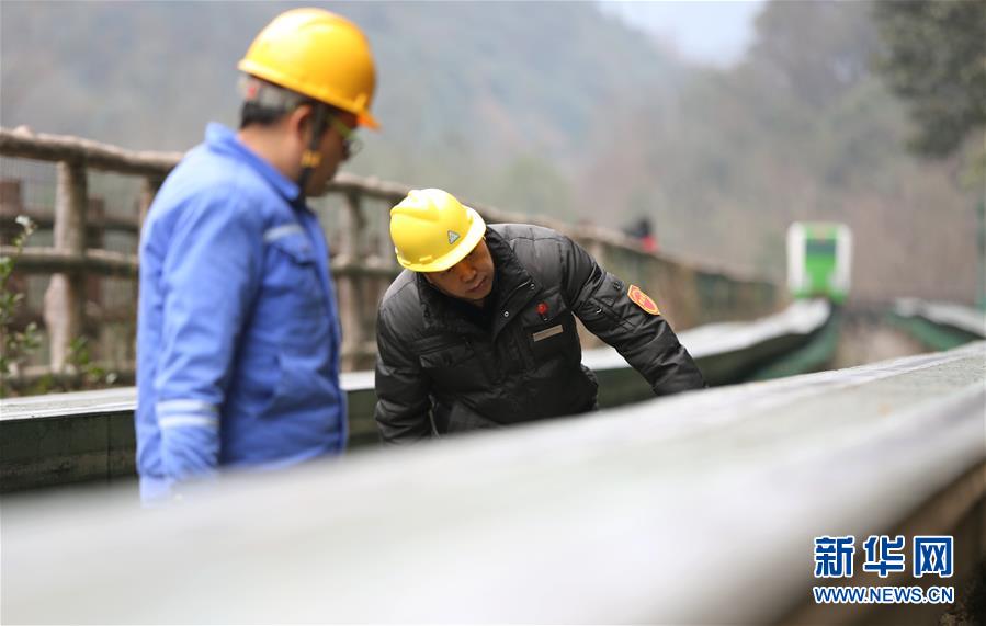 1月24日,张家界武陵源十里画廊观光电车的工作人员在检查电车轨道运行情况。