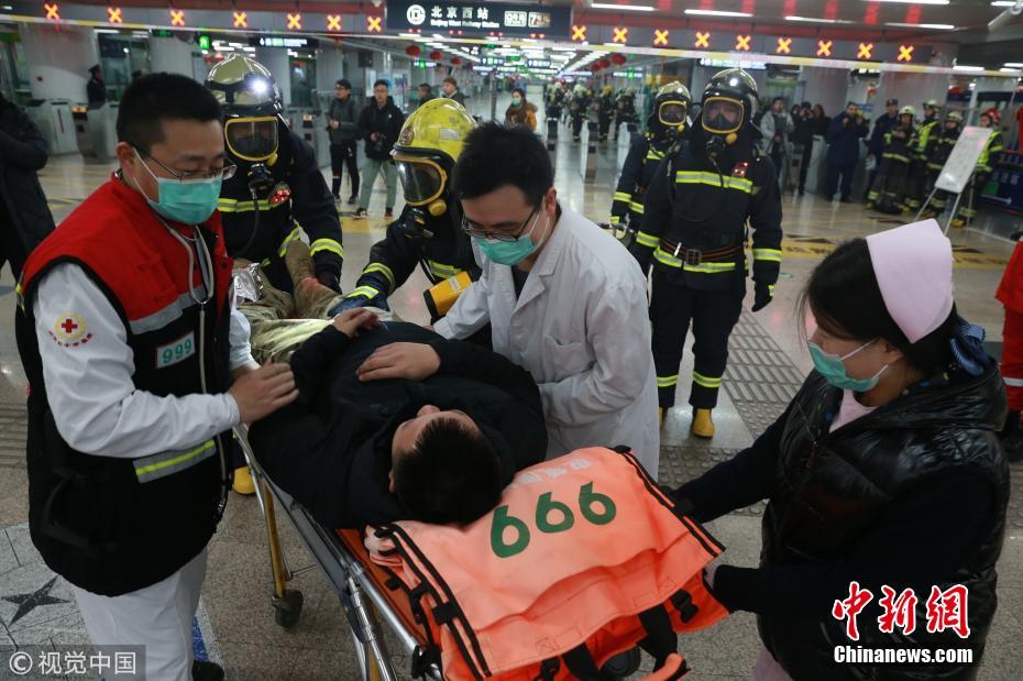 为做好2019年春运期间大型交通枢纽应急处置各项准备工作,2019年1月25日凌晨,北京市消防总队、西站地区管理委员会紧密结合春运期间北京西站集中返乡、探亲客流与正常通勤客流叠加,人流客流高位运行的特点,联合地铁北京运营公司、北京市急救中心等单位,在北京西站地铁站举行灭火救援实战演练,全面检验消防队伍冬训实战化练兵成果和社会单位突发火情安全疏散、灭火救援、应急处置等预案措施,全面提升消防安全防护等级。陈健男 摄 图片来源:视觉中国