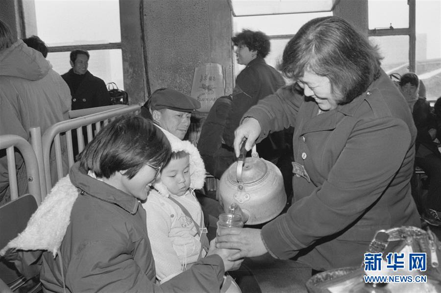 1993年1月14日,在北京火车站候车区,车站服务员韩秀琳(右)在为旅客送水。