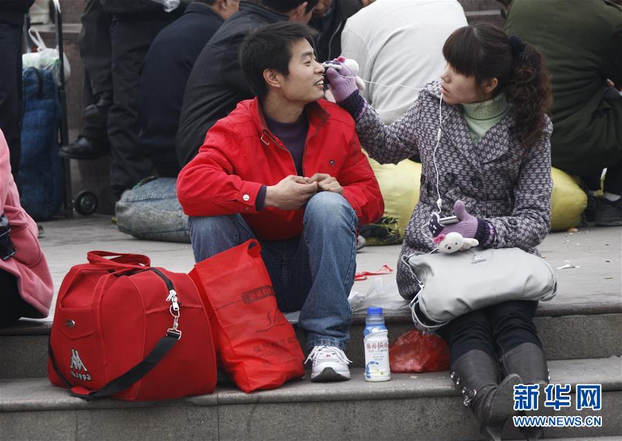 2010年1月30日,将返乡过年的河南商丘人袁冠军(左)在上海火车站站前广场候车时与女友一起分享音乐。新华社记者 裴鑫 摄