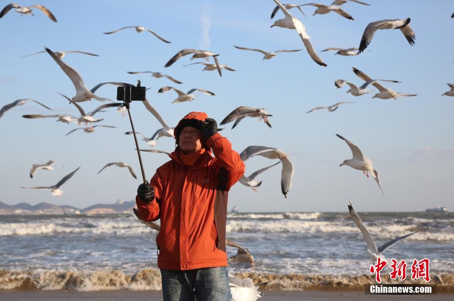 1月25日,山东烟台第一海水浴场海鸥翔集,时而捕食,时而起舞欢闹,吸引了许多民众驻足拍照。当地浴场管理员还前来投喂新鲜海鱼,为海鸥补充食物,引得海鸥们腾空而起,争抢食物,成为冬日里一景。王娇妮 摄