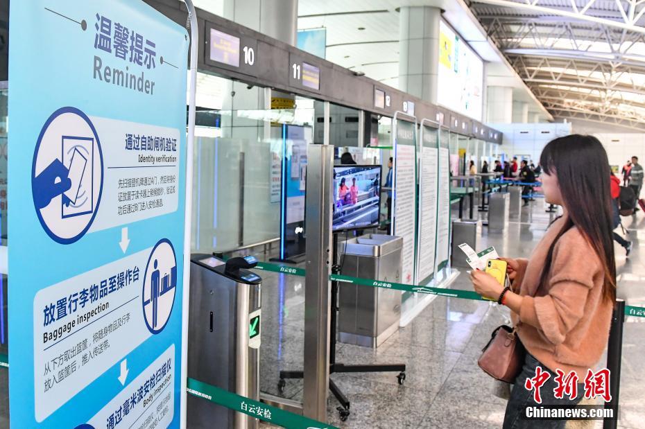 1月25日,旅客通过“自助智能安检通道”进入候机楼。当日,广州白云机场在T1航站楼安检B区启用“自助智能安检通道”,该通道融合应用了人脸识别、人包对应、毫米波安全门及篮筐回传等技术。中新社记者 陈骥旻 摄