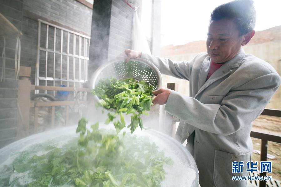 1月24日,在贵州省毕节市大方县易地扶贫搬迁城镇化安置区奢香古镇,龙诗有往豆浆里加蔬菜。新华社发(罗大富 摄)
