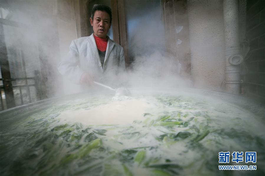 1月24日,在贵州省毕节市大方县易地扶贫搬迁城镇化安置区奢香古镇,龙诗有制作菜豆腐。新华社发(罗大富 摄)
